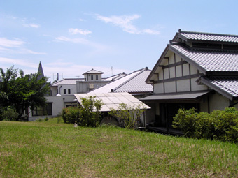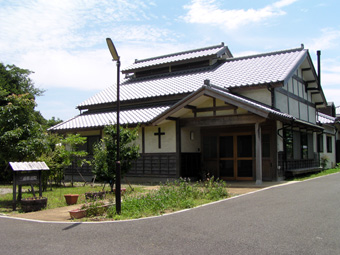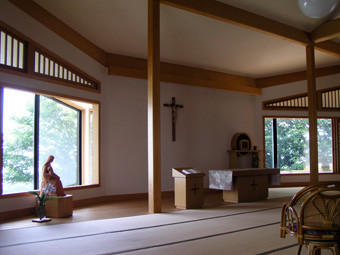 ![]() 宣教棟の和室 (東面の庭) (パンやピザを焼く石釜、右の塔が鐘楼) |