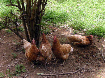 ![]() 柵内で鶏の放し飼い (約10羽)