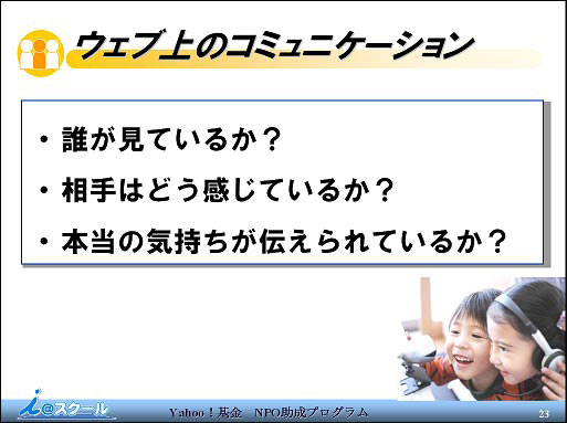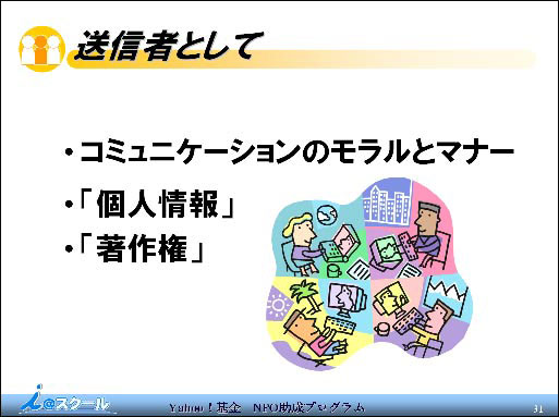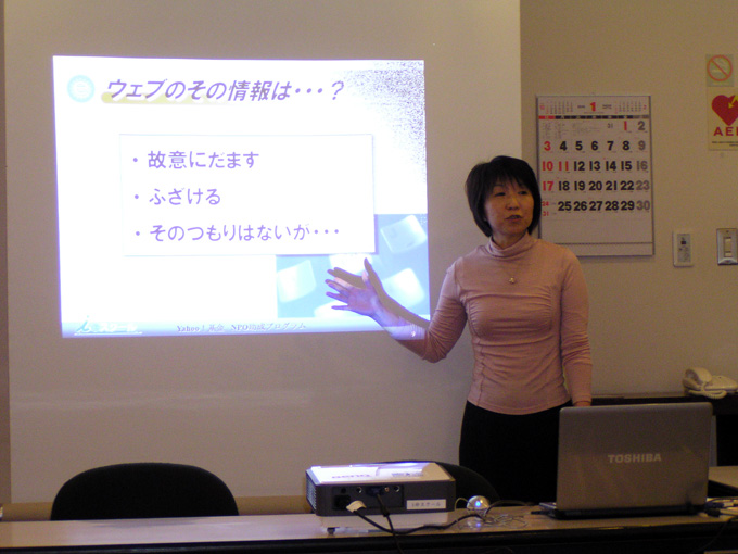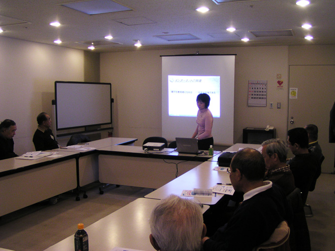 2010年1月の定例会議の前に「インターネット安全教室」と題した勉強会を行いました。講師はNPO法人教育情報化支援室の藪りかさんです。昨年末に同法人の知人小森さんからお話しがあり講義していただくことにしたものです。事前に永島代表ともメールで打ち合わせして実現したものです。