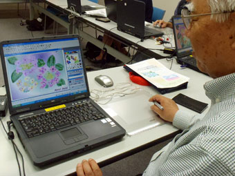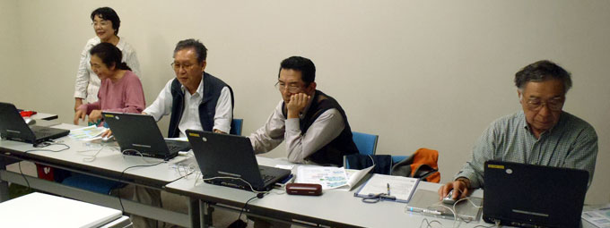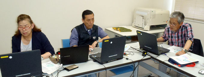 横須賀市生涯学習センターでパソコン水彩画の講座を開催している久野昌子(NPO 生涯教育電彩大学電彩アート認定講師)さんと大橋邦子(パソコン水彩クラブ)さんのお二人にお願いしてシニアネット横須賀の会員のために「水彩7」の体験講座の講師とアシスタントをお引受けいただきました。 (2011年5月26日、横須賀市生涯学習センター ミーティングルーム、13時〜16時30分)
