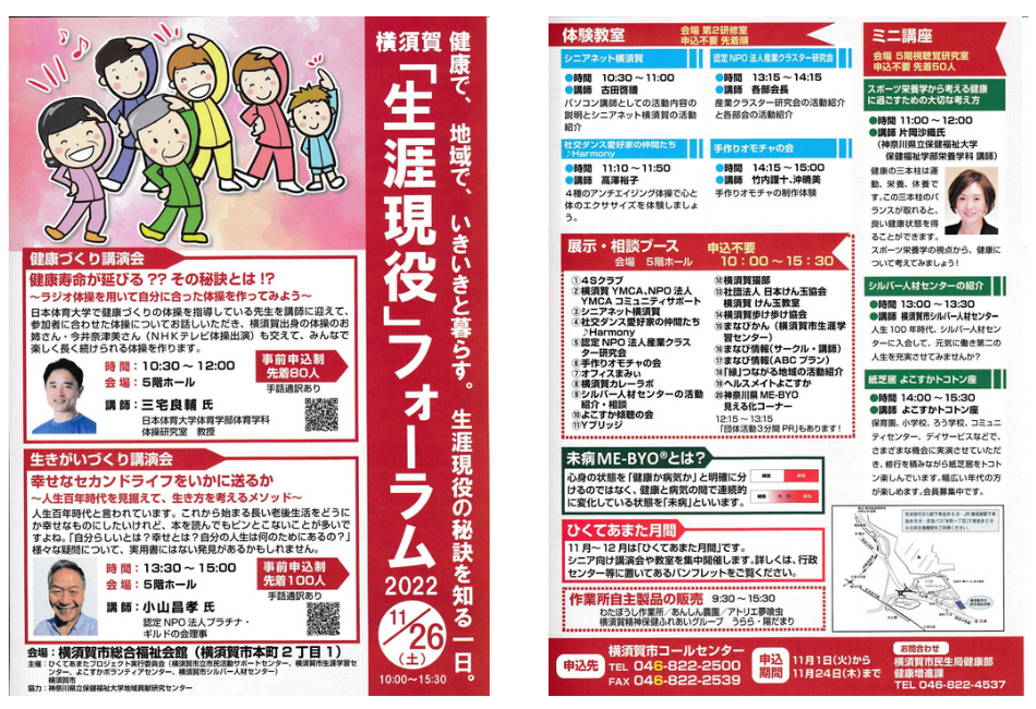 11月26日、横須賀市総合福祉会館で行われた横須賀市立市民活動サポートセンター主催による「生涯現役」フォーラム2022に 展示参加をいたしました。 シニア向けの講演のプログラムが5階のホールを含め3か所の部屋に分かれて開催をされました メイン会場となった5階のホールでは講演会の後ろのスペースで沢山の団体の展示ブースが並び、皆さんそれぞれの興味のある 団体のブースに立ち寄るスタイルでした。 シニアネット横須賀にも来場の方が訪れ、説明員の会員から詳しい活動内容などを聞いていただきました |