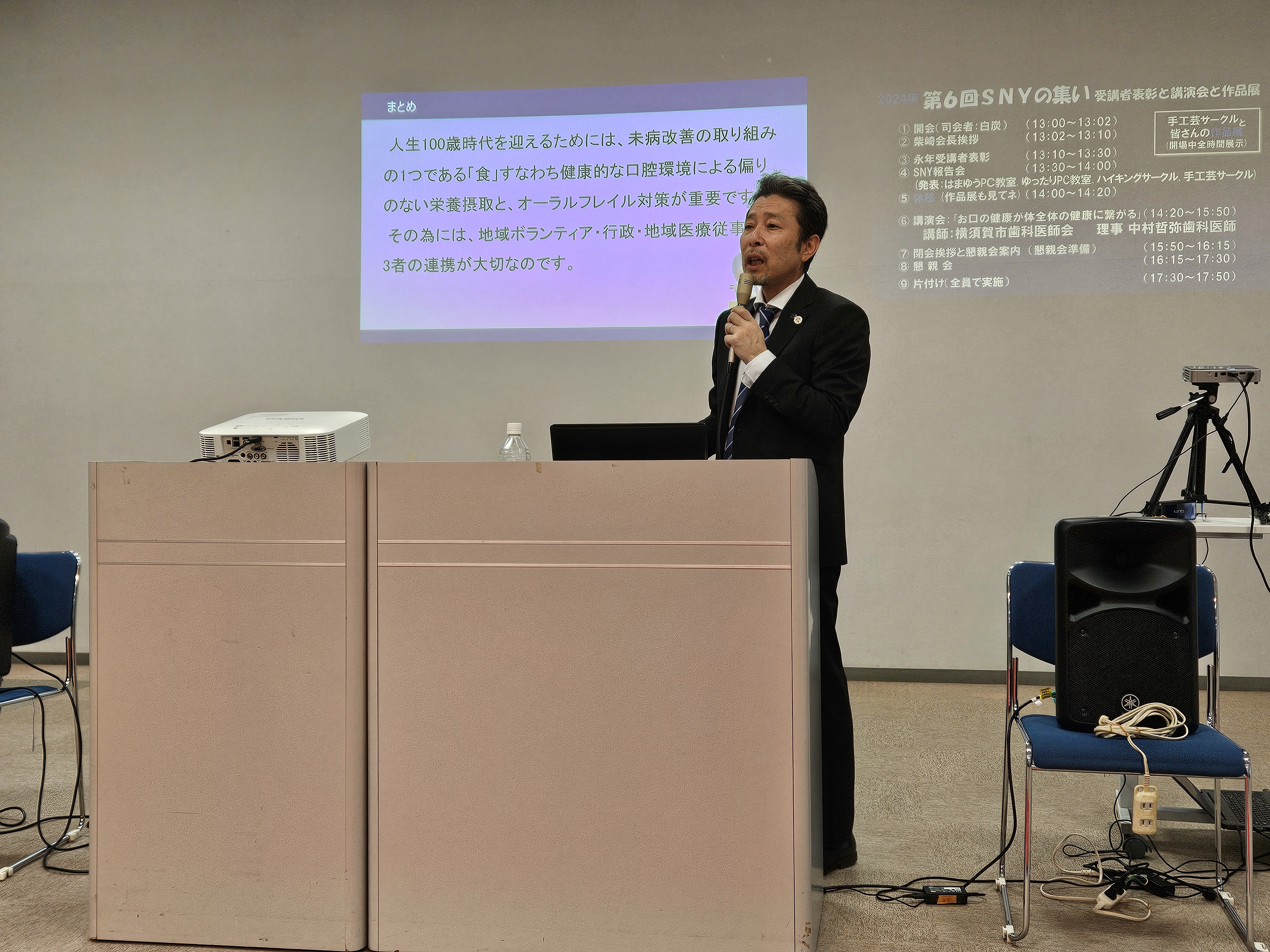 一般社団法人横須賀歯科医師会公衆衛生担当理事 中村哲弥様のお話をお聞きいたしました 今回は健康寿命を延ばすため「食」「運動」「社会参加」の3つの柱の「食」の部分に ついてのお話です 口腔には、食べる機能や、会話をしてコミュニケーションをとる機能などがあります 食べるためには、歯で食物をかみ、飲み込むという一連の動作が必要です 口腔ケアの目的は口のなかを清潔にするだけでなく、歯や口の疾患を予防し、 口腔の機能を維持することにあります 適度の運動(散歩)と親しい仲間との会話の機会を持つことが大切なことのようです 日ごろからオーラルフレイルを心がけましょう ありがとうございました |