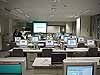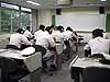 コンピュータ教室は今年設置した最新のもので、学生の机上には自分の端末のほかに教官からの指示・指導を受ける大きめのモニター(2人に1台)があります。教官側には学生の進度を3秒ごとにスキャンして監視するモニターのほか画像入力装置が設備されています。教室の照明はOAルーバ付の蛍光灯器具でモニターへの光の映り込みを防止しています。