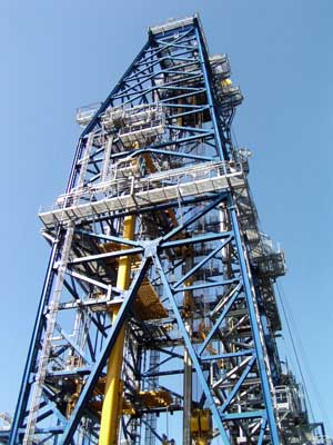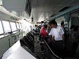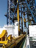 操舵室では船を定位置に停泊させる船位保持システムほかを見学し、後方のやぐら(Derrick)周辺でライザーパイプ(外形1.2m、全長27m)やドリルビットなどについて説明を受けました。掘削を担当するのはノルウェー人だそうです。乗組員100名。