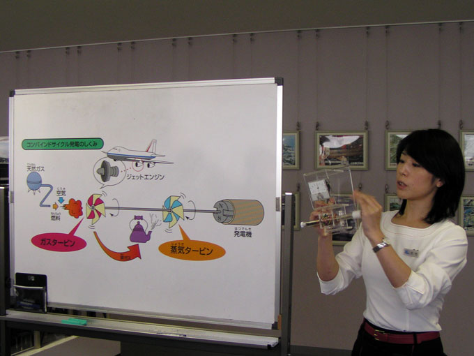 横浜火力発電所は横浜市営バス17系統に乗車して約20分の所にあります。PR館のトゥイニーヨコハマのホールでビデオを見てから2班に分かれて高さ200mの煙突を見学、その後に発電所を見学しました。横浜火力発電所は昭和37年から発電しているそうですが私たちが見学したのは平成10年から稼動しているガスタービンの廃熱で蒸気タービンを動かす複合型の新しい発電設備(ACC)です。汽力の熱効率42%に対しACCは54%で1日に1万本のドラム缶分の燃料が節約されるそうです。中央操作室(撮影禁止)では大小さまざまなモニターを5〜6人で監視していました。(ACC: Advanced Combined Cycle 改良型コンバインドサイクル)