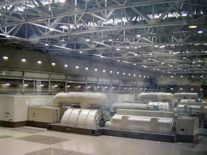 ![]() 蒸気タービンと発電機(右) (拡大) ガスタービンは左奥 |