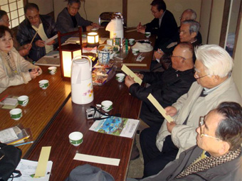 ![]() 横笛庵の土間で月例会 (句集)、隣室は茶室 |