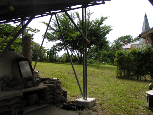 ![]() 宣教棟の和室 (東面の庭) (パンやピザを焼く石釜、右の塔が鐘楼) |