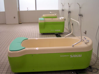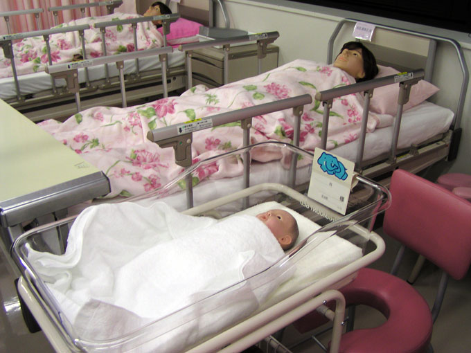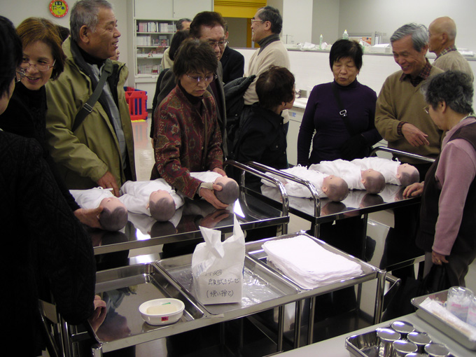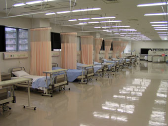 ![]() 両側にベッドの並ぶ実習室 (人形の保管棚) |