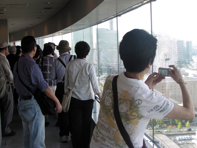 展望ロビーは外観写真の上部に円弧状に飛び出ている所です。南側からは中央に横浜スタジアム、東にマリンタワーが望めます。北側からは横浜港が一望できます。眼下に大さん橋埠頭、赤レンガ倉庫、東には氷川丸、西にはヨコハマグランドインターコンチネンタルホテルから横浜ランドマークタワーまでのビル群が並び美しい眺めです。