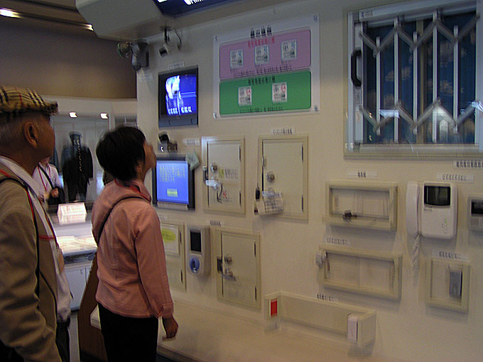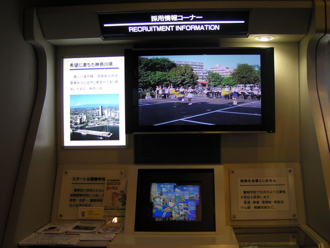 職員募集などのコーナーがあります。小中学生用のクイズコーナーもあります。 見学者説明室は警察官の職種と役目を紹介するビデオと警察の活動と歴史を説明するビデオ2本を上映しました(約15分)。小中学生にはクイズのビデオもあるようで各席に正解を答えるボタンが並んでいます。 |
