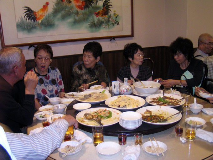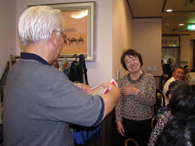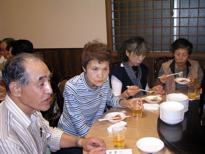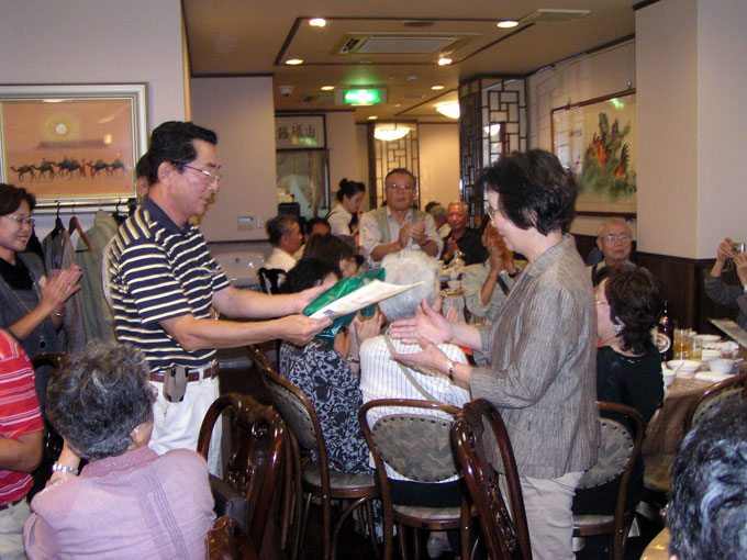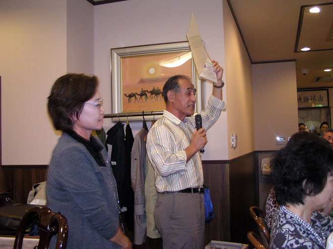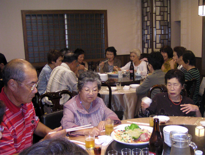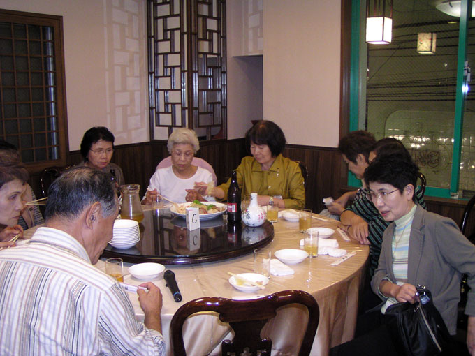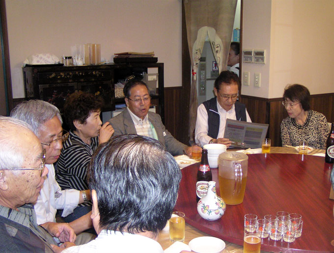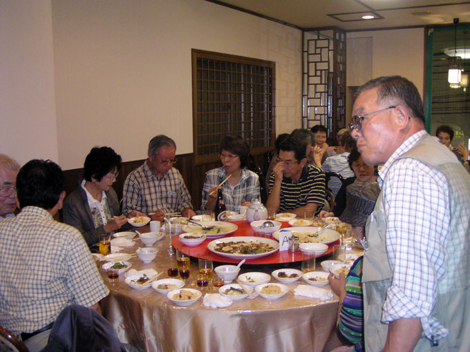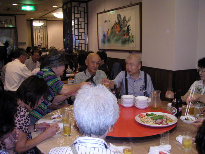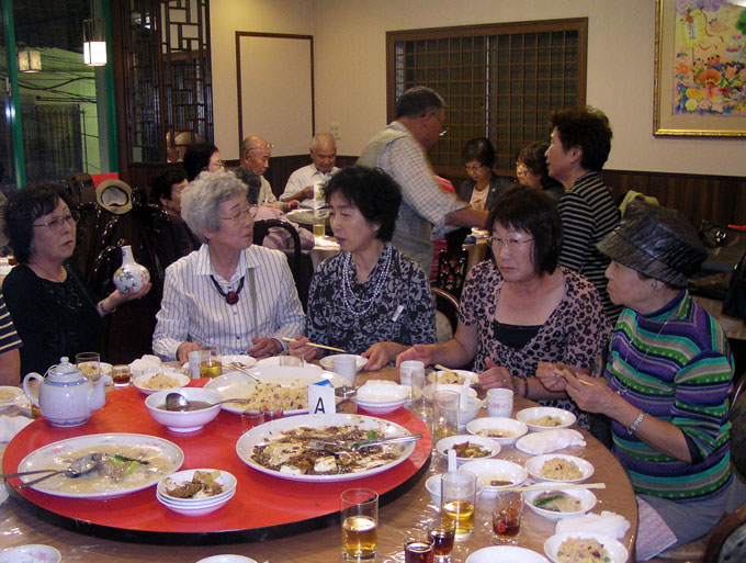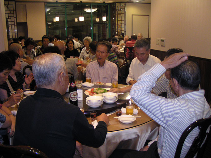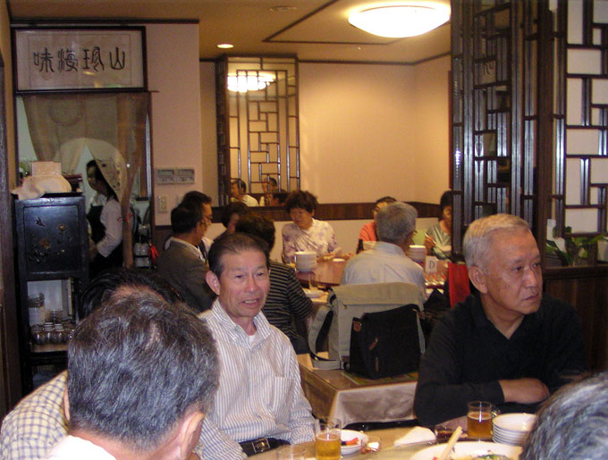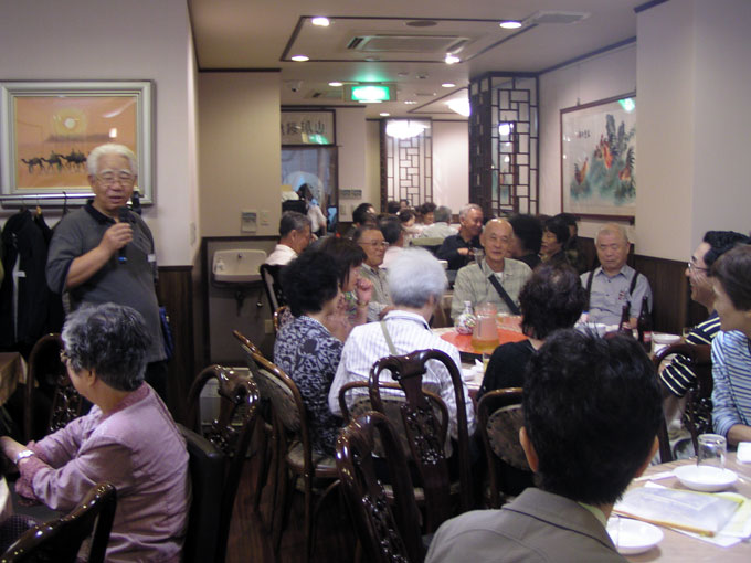 懇親会場までの道筋にある名所見物を終えて中華街の「富筵」(ふえん)に到着したのは17時30分でした。2階に上がりあらかじめ決められたテーブルに着き会費を納めました。なにしろ57人という大勢の参加で役員さんは大変です。