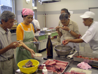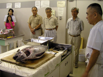 ![]() マグロの説明をする洒落弁会 増渕会長 (右) (元高校教師の大森さん、解体 2、解体 3) |