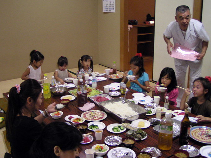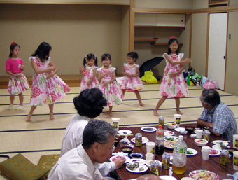 洒落弁会の子どもフラグループ「オハナ」(指導者 井上さん)が急遽出演してくれることになり、夕食会を楽しいものにしてくれました。今年始めの結成で今回の出演者は小学4年生が2人、1年生が2人、幼稚園児2人でした。この夏ソレイユの丘のステージに出演することも決まっているとのことでした。