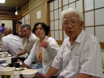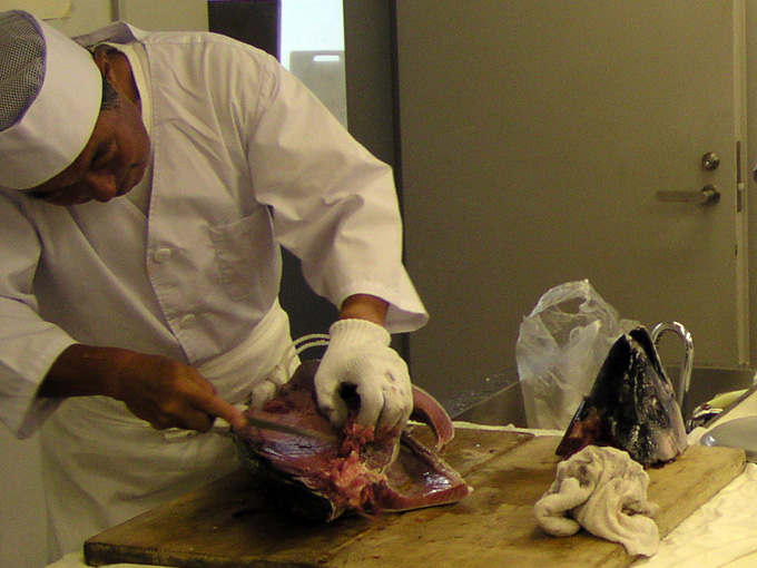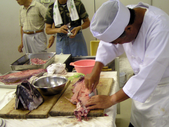 この日のマグロの解体ショーに使われたマグロはメバチマグロで10kg程度のものです。洒落弁会の増渕会長は30〜50Kgのものになれば脂肪ものり美味しいのだがこの人数(シニアネット 13人)でこの値段(3,000円/人)では味を求めるのは無理でさばき方を間近で見ることと夕食会そのものに意義を見出して欲しいと話されました。
