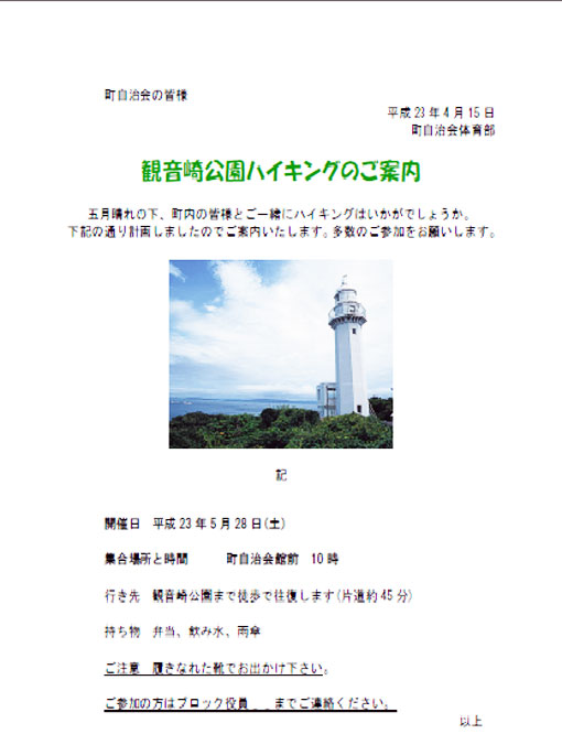 ![]() ハイキングのチラシ (画像をクリックすれば拡大します)