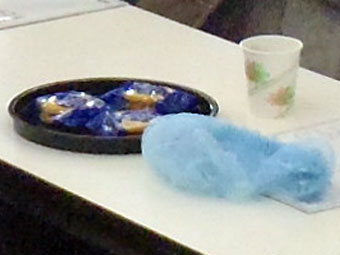 森永製菓鶴見工場の敷地内で全員集合するのを待って工場見学の説明を聞くエンゼルホールに入りました。机上にパンフレットと暖かいミルクココアとビスケットが用意されており、説明やビデオを見ながらいただきました。