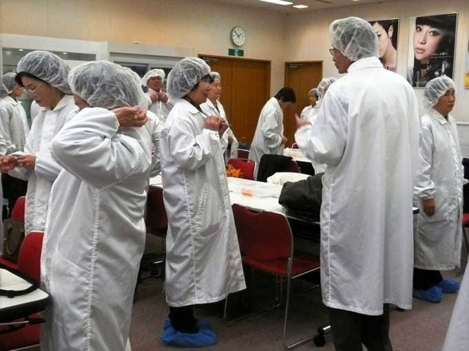 ![]() 見学概要説明、VTRによる工場案内 (拡大、案内スタッフ、案内スタッフ 2) ![]() 靴カバー着用、白衣、着帽 (拡大)、手洗い、除塵 エアーウォッシャー後に見学通路へ |