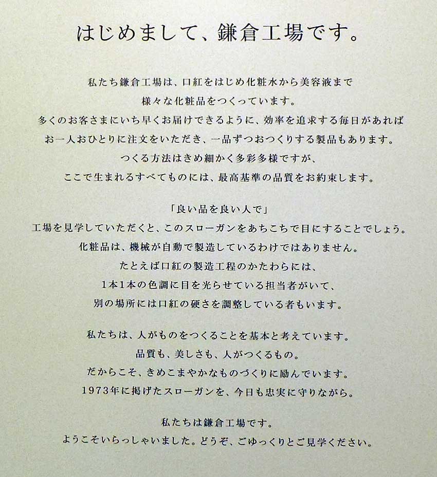 美白美容液、クリームなどを生産しています。鎌倉工場のスローガンは「良い品を良い人で」です。これは1973年から忠実に守られているそうです。多量生産のラインは整備中で、少量生産のラインと高価格商品のラインを窓越しに見学しました。高価格商品のラインは専用の部屋になっており照明設備もカバー付きとクリーン度を上げているように感じました。