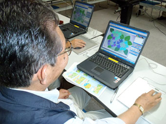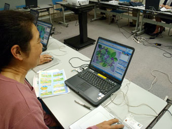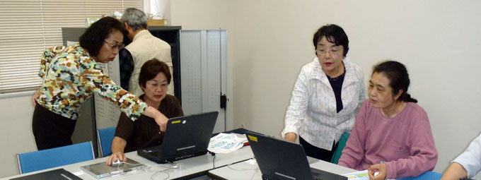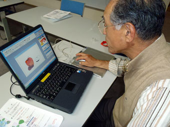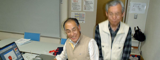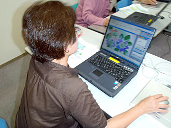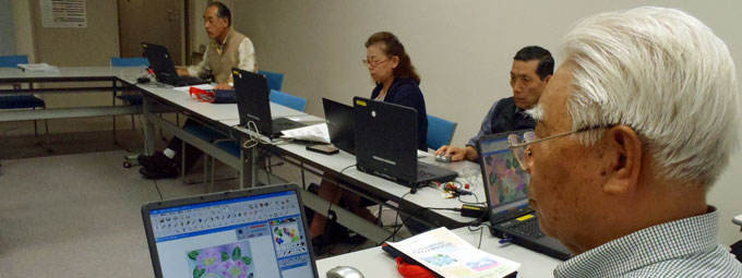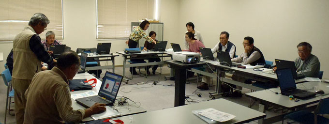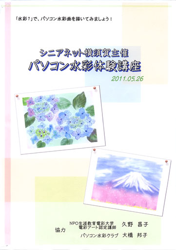 横須賀市生涯学習センターでパソコン水彩画の講座を開催している久野昌子(NPO 生涯教育電彩大学電彩アート認定講師)さんと大橋邦子(パソコン水彩クラブ)さんのお二人にお願いしてシニアネット横須賀の会員のために「水彩7」の体験講座の講師とアシスタントをお引受けいただきました。 (2011年5月26日、横須賀市生涯学習センター ミーティングルーム、13時〜16時30分)