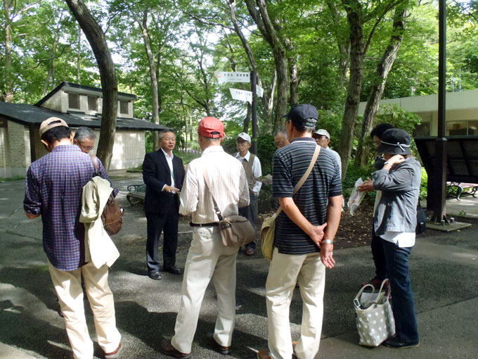 ![]() 深大寺門傍の雑木林からスタート (拡大) (左から3人目 高橋康夫園長) |