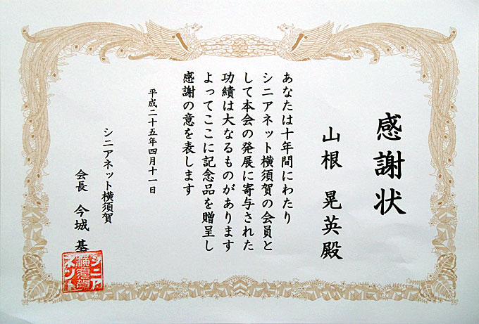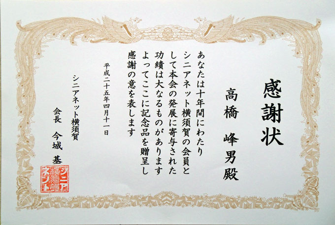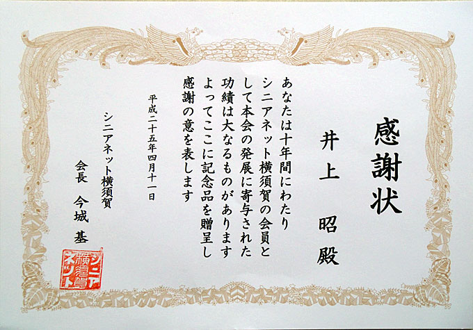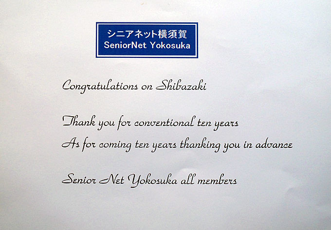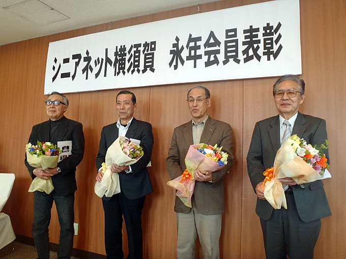 表彰された4人はシニアネット横須賀 (発足1999年)の現在を作った方々です。10年間のボランティア活動とご苦労に感謝申し上げます。