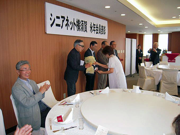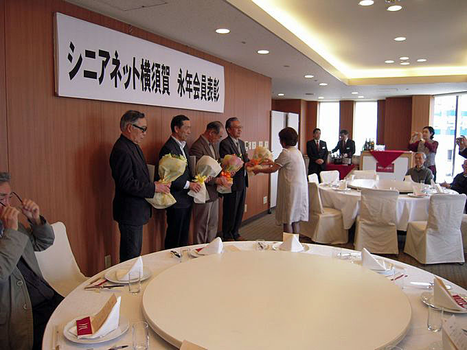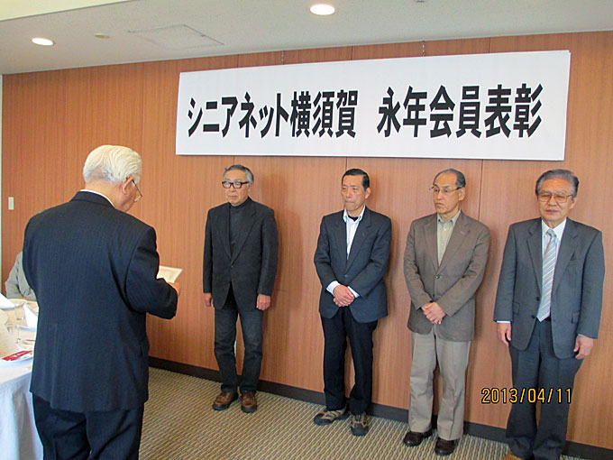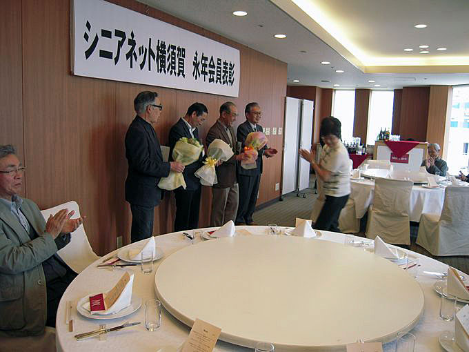 シニアネット横須賀に2003年に入会し満10年を迎えた柴崎さんと2004年に入会し今年で10年を迎える井上さん、高橋さん、山根さんの永年表彰式と祝賀会を2013年4月11日(木)にメルキュールホテル横須賀で行いました。