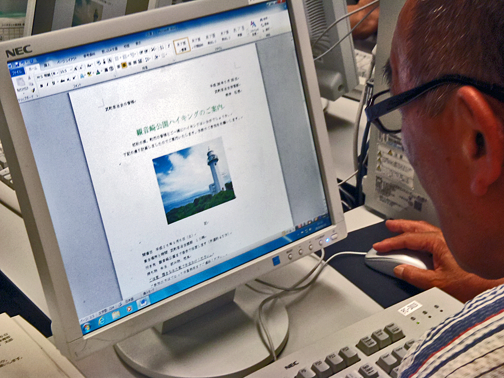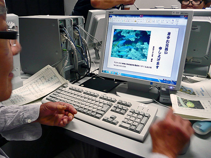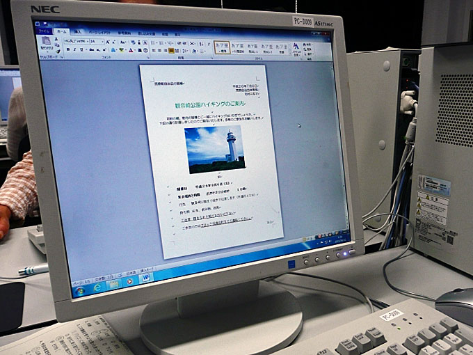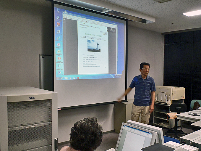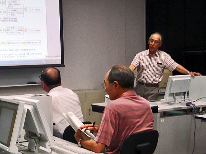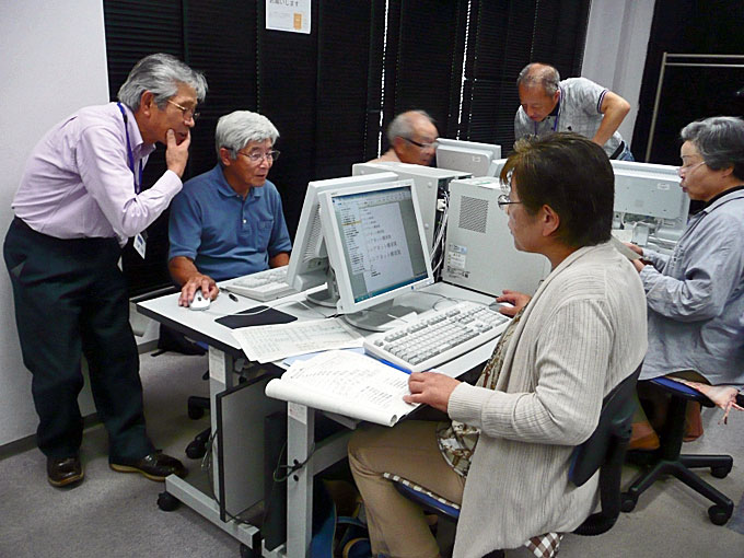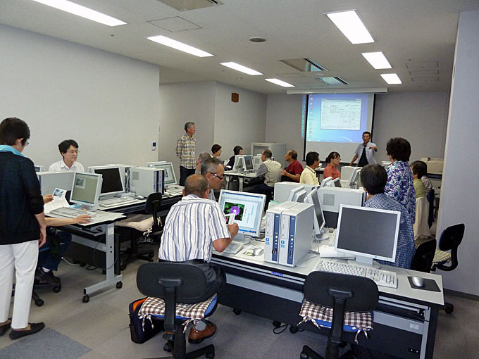 パソコンが初めての60才以上の人が対象で最大16人。講座の内容はパソコンの構成、ハードウェアとソフトウェア、マウスの基本操作、文字入力の練習、文字の大きさとフォント、インターネットの操作法、ワードでちらし作成、はがきの裏面作成(暑中見舞)、画像の取り込みなどです。 Windows 7 、Office 2010の環境での講習です。