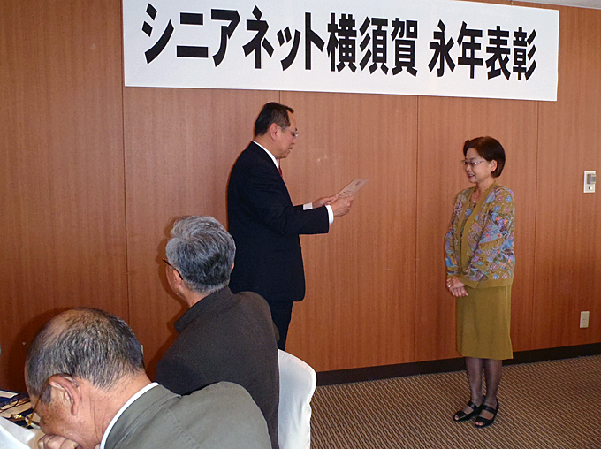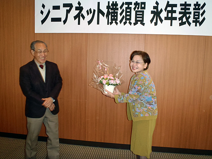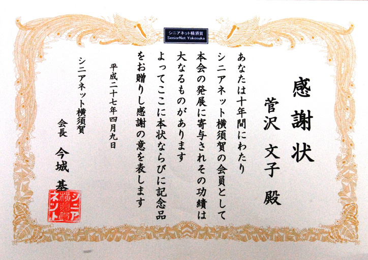 菅沢さんはシニアネット横須賀 (創立1999年)で初めての女性永年受彰者です。10年間のボランティア活動とご苦労に感謝申し上げます。