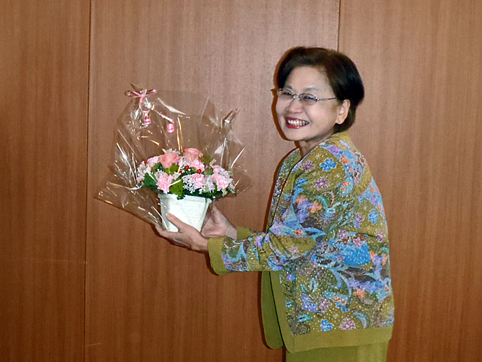 ![]() フラワーアレンジメントを贈る高橋さん(新幹事) (拡大) (菅沢さん) |