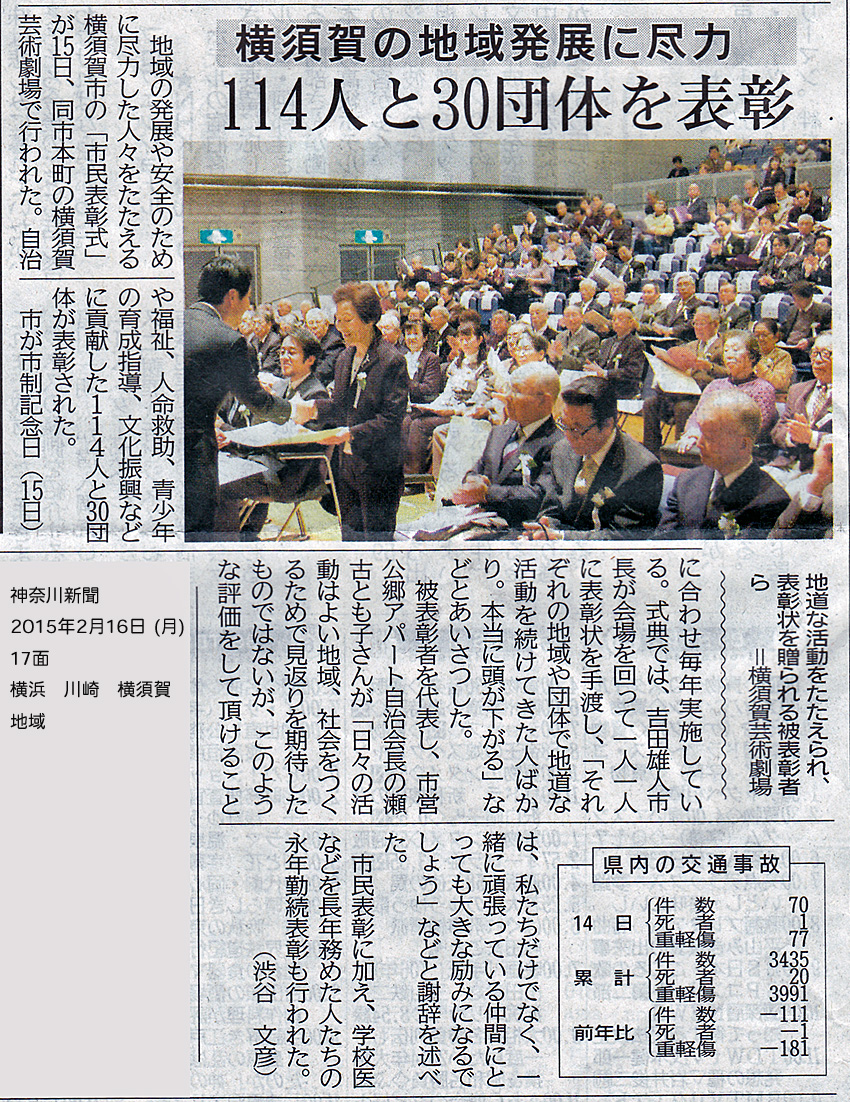 ![]() 市民公益活動に貢献した3団体 (拡大) (横須賀歩け歩け協会、よこすか市民会議、シニアネット横須賀) |