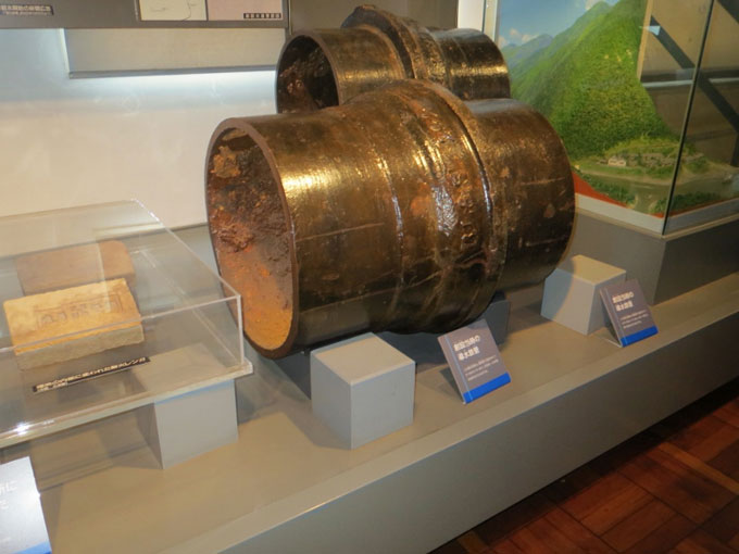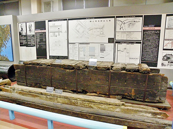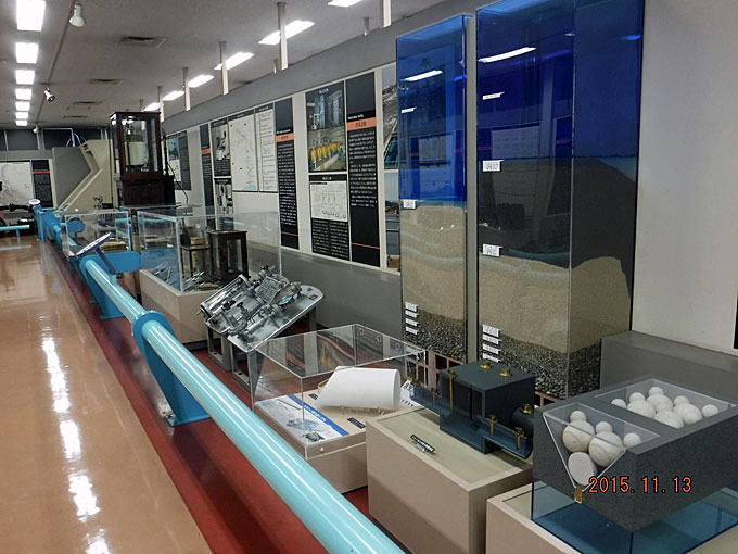 ?水道の技術的な資料、水道技術の移り変わりを解り易く展示されている ?西谷浄水場の特徴である“自然流下方式”の全域パネル表示、発掘された木樋水道、導水管(鍛接鋼管)、明治・大正給水装置など |