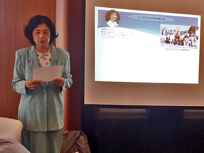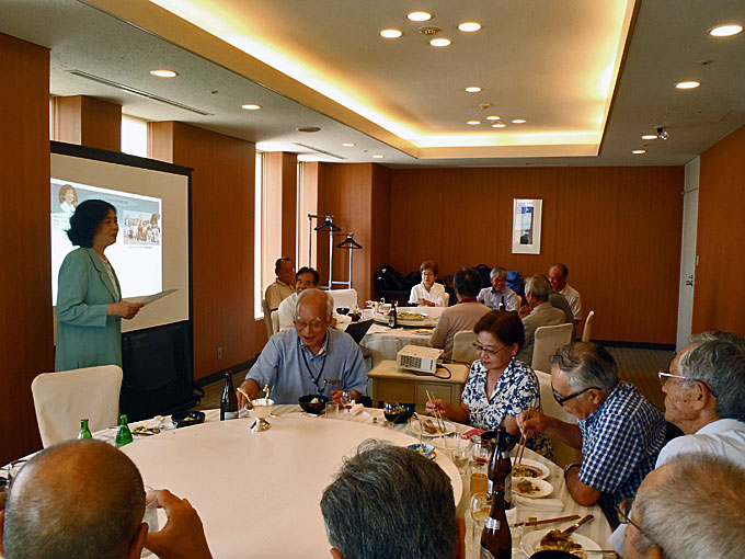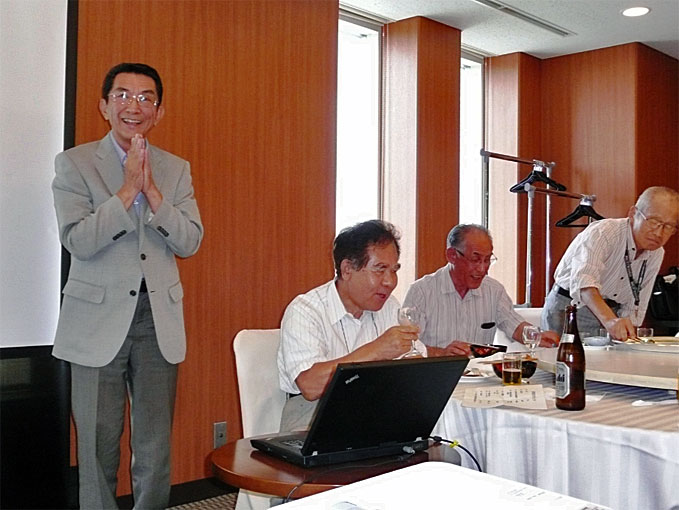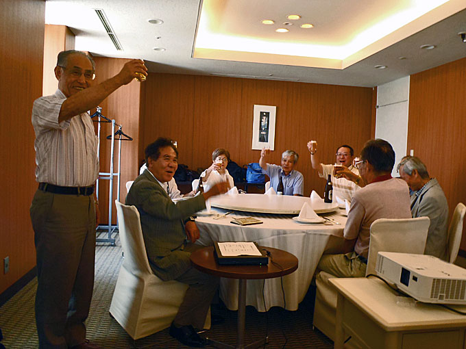 永年会員表彰式のあと、同じ会場で祝賀会を開催しました。 高橋幹事から永年表彰された飯塚さんと迎さんにお祝いの挨拶の後、乾杯をしました。 飯塚さんと迎さんから永年表彰のお礼と入会の動機、10年間の想い出、これからの活動に対する抱負などが披露されました。山野内さんが用意されたPower Pointのプレゼンテーションが内容を分かりやすくしてくれました 美味しい食事とお酒とお二人を祝って和やかで楽しい懇談をしました。その様子は写真をご覧ください 最後に古田幹事が閉会の挨拶をした後、一本締めをしてお祝いの会を終えました。 |