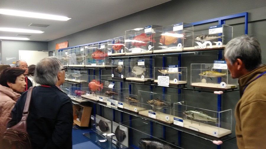 概要説明の後、製造実験施設、海洋・生態系研究施設、海洋放射能研究施設、図書資料館の魚類剥製標本などを見学させていただきました