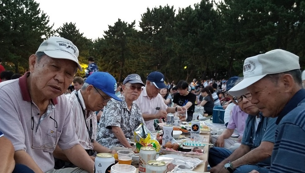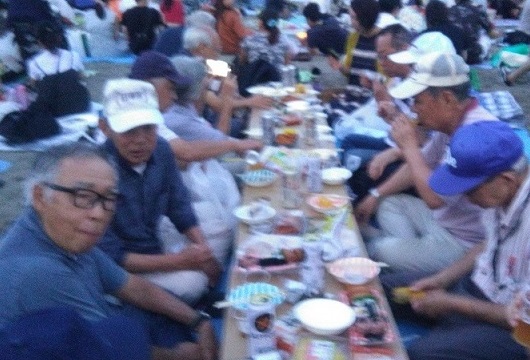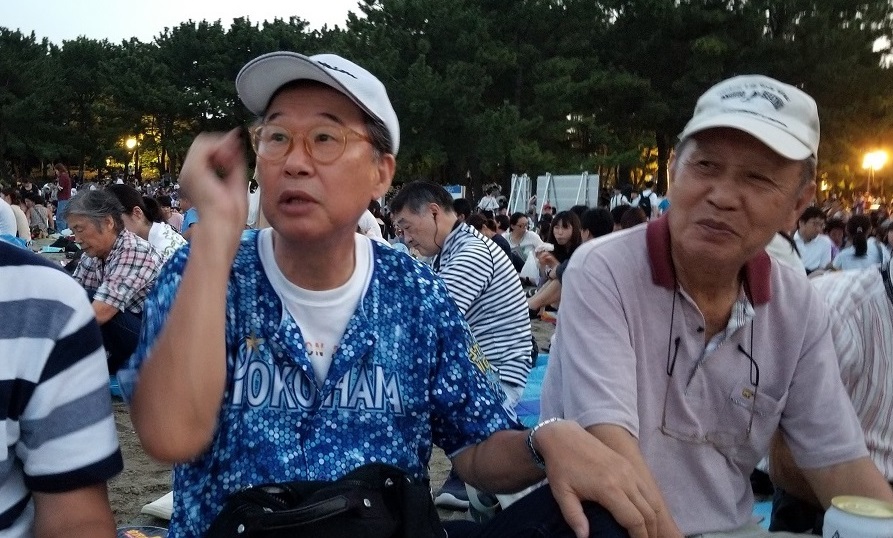 8月24日(土)金沢八景駅17時に集合、先発隊は場所取りとセッティング、後発隊は近くのスーパーで買い物です お天気も良く、風もあり、花火には絶好の日和となりました シーサイドラインにもたくさんの観客が乗車のため、長い行列を作ってようやく乗車できた状況でした あたりが暗くなり始めた時間帯から、乾杯、歓談をしながらの打ち上げの時間を待ちました。 19時から始まった花火は3500発、約1時間の競演でした。
