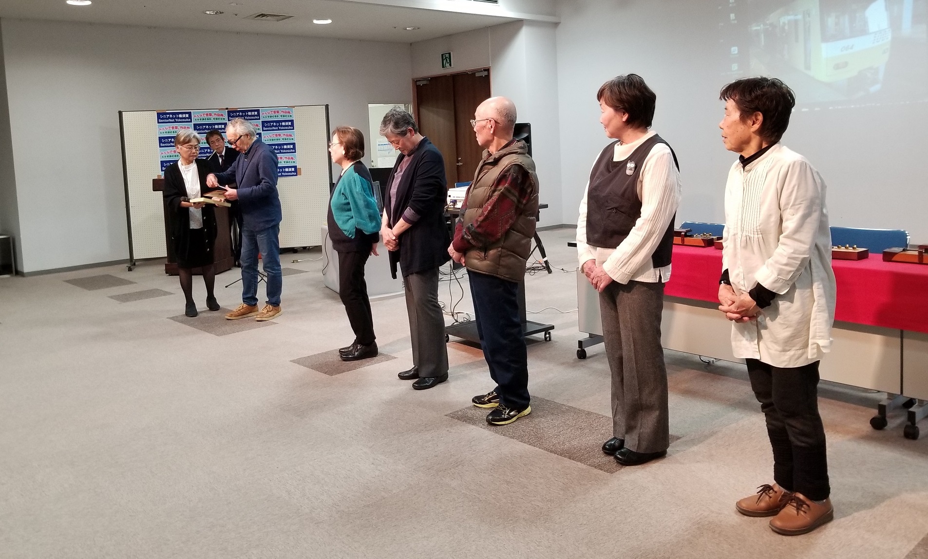ミナトPC:草間さん、ゆったりPC:米山さん、シニアネットきさらぎ:板谷さん.西原さん.渡辺さん の5人が柴崎会長より表彰状と副賞が授与されました