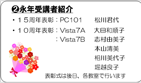 15年表彰者1名、10年表彰者5名 計6名の対象者があり、各教室にて賞状と